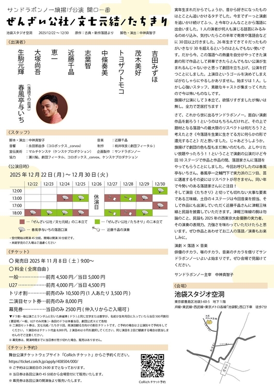 2025年12月 22日(月) 18:00☆🪭 23日(火) 18:00★🪭 24日(水) 13:00☆🪭/18:00★🪭🐯 25日(木) 13:00★🪭/18:00☆🪭 26日(金) 休演日 27日(土) 13:00☆👘/18:00★👘 28日(日) 13:00★👘/18:00☆👘 29日(月) 13:00☆🪭/18:00★🪭 30日(火) 12:00★🪭/17:00☆🪭 ☆…ぜんざい公社/文七元結 ★…ぜんざい公社/たちきり 🪭…春風亭与いちによる落語口演 👘…近藤千晶による津軽三味線・民謡の演奏 🐯…アフタートーク(出演:中神真智子、春風亭与いち、近藤千晶) |
